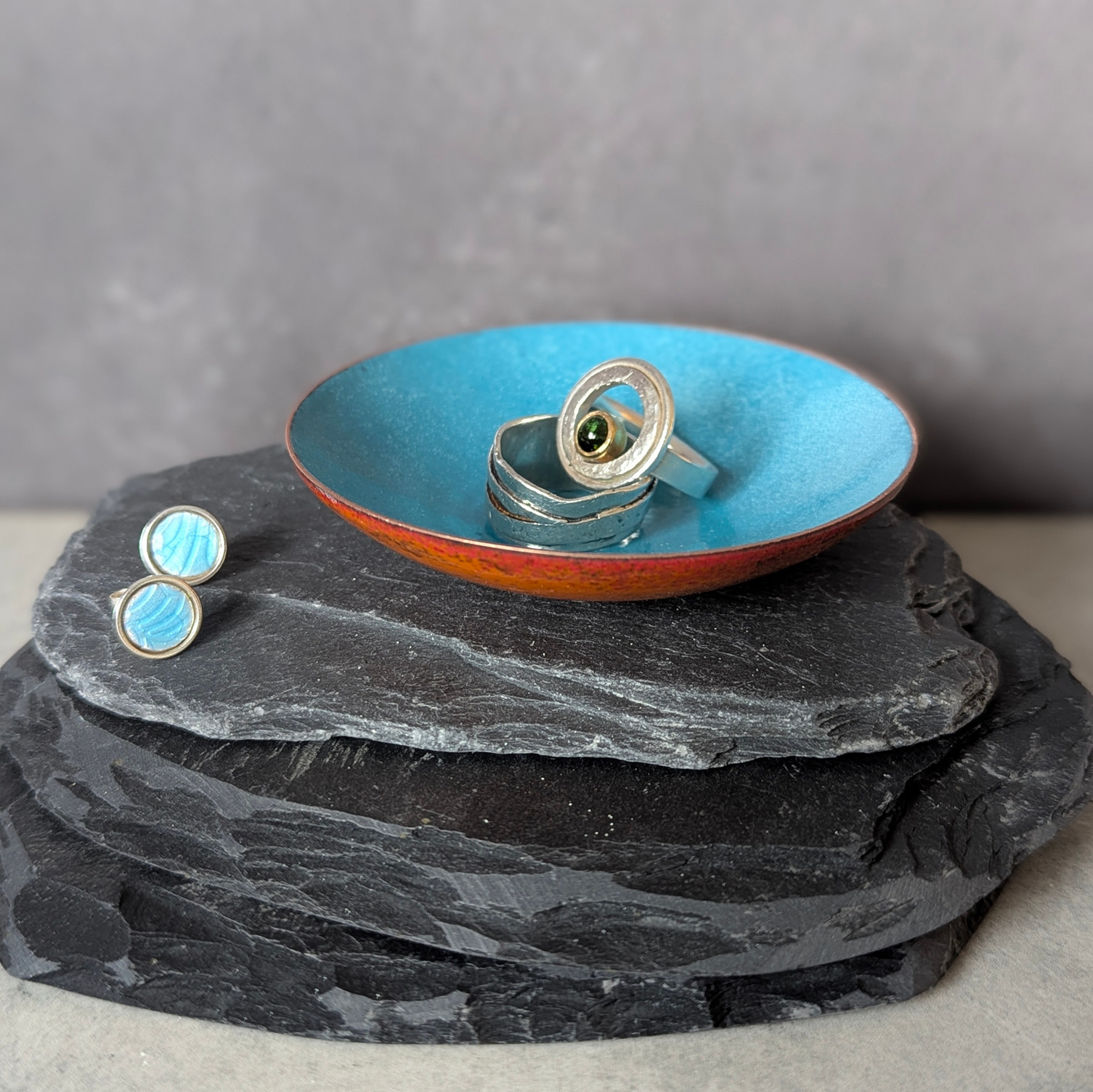 Celebrate your individuality through colour, texture and shape. I create contemporary, easy‑to‑wear silver jewellery alongside a growing collection of enamel dishes and picture panels. Whether I’m working with gemstones, gold accents or richly layered enamel, each piece is crafted to explore expressive colour and tactile detail, bringing a unique sense of character and artistry to your everyday life.